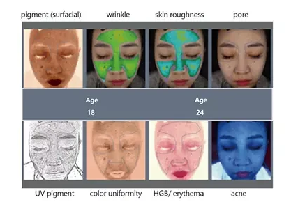 2.Separates the unique color skigatures of red and brown skin componets for visualization of conditions such as spider veins,hyper pigmentation, rosacea and acne.